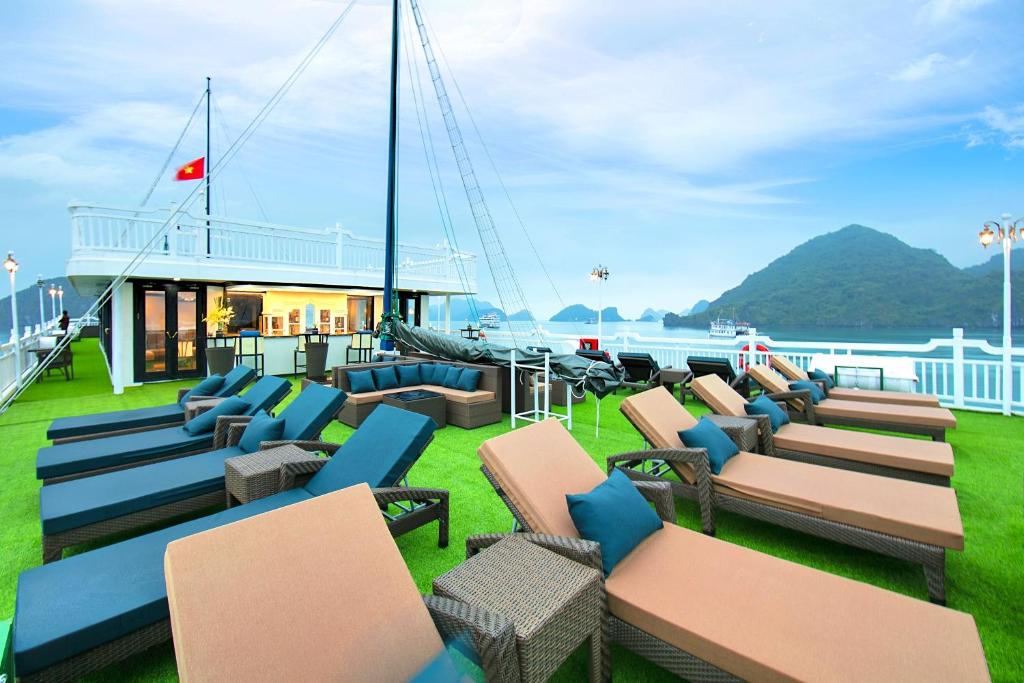 Morgens reisen Sie zur Halong-Bucht, wo Sie um die Mittagszeit an Bord Ihres Kreuzfahrtschiffes gehen. Die weltberühmte Bucht, die 1994 zum UNESCO-Weltkulturerbe erklärt wurde, bietet mit ihren rund 1.900 üppig bewachsenen Felseninseln eine der spektakulärsten Landschaften Vietnams. Genießen Sie die Fahrt durch diese unberührte marine Kulisse, während Ihnen das Mittag- und Abendessen an Bord serviert wird. (F/M/A)